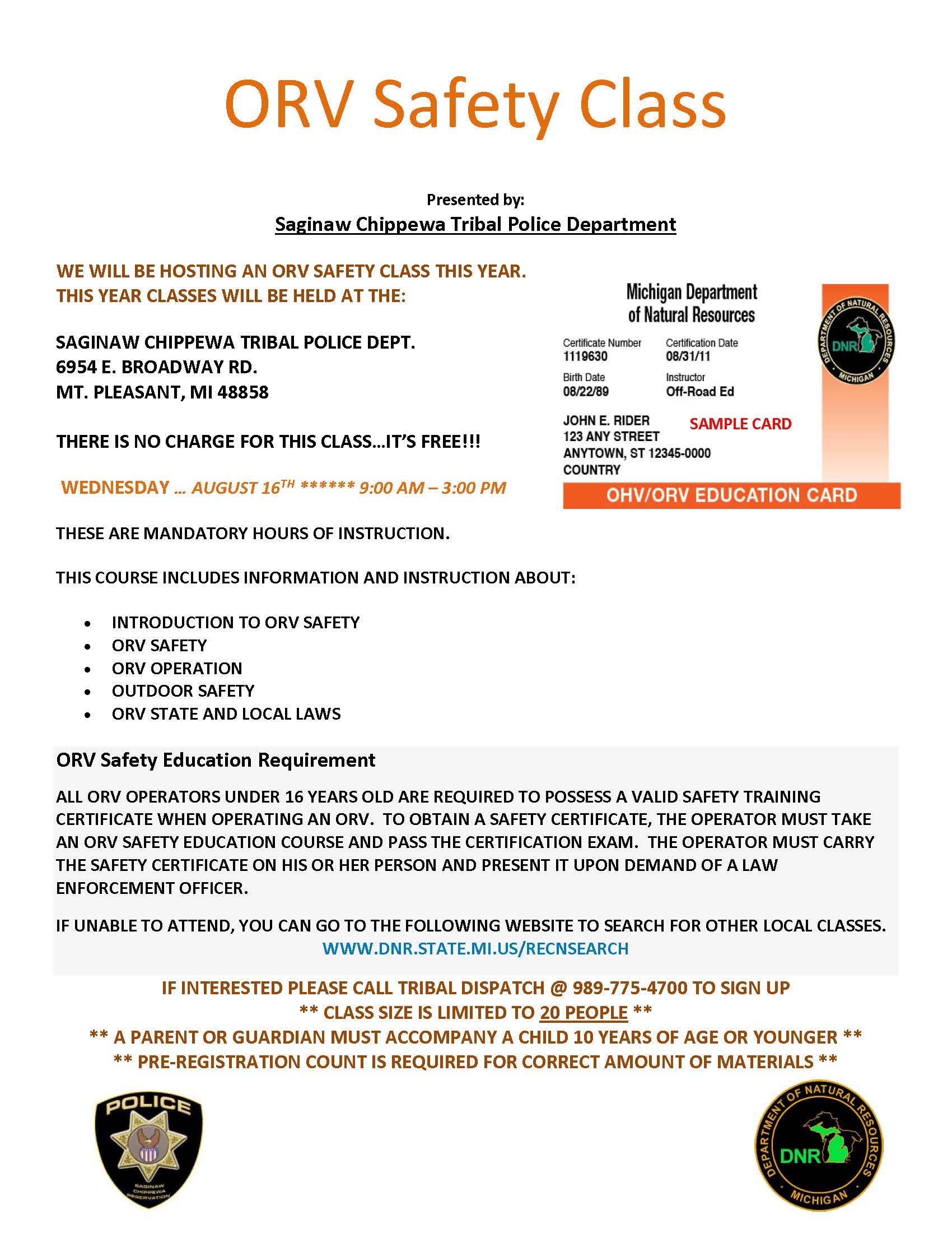 ORV Safety Class | August 16 9AM to 3PM