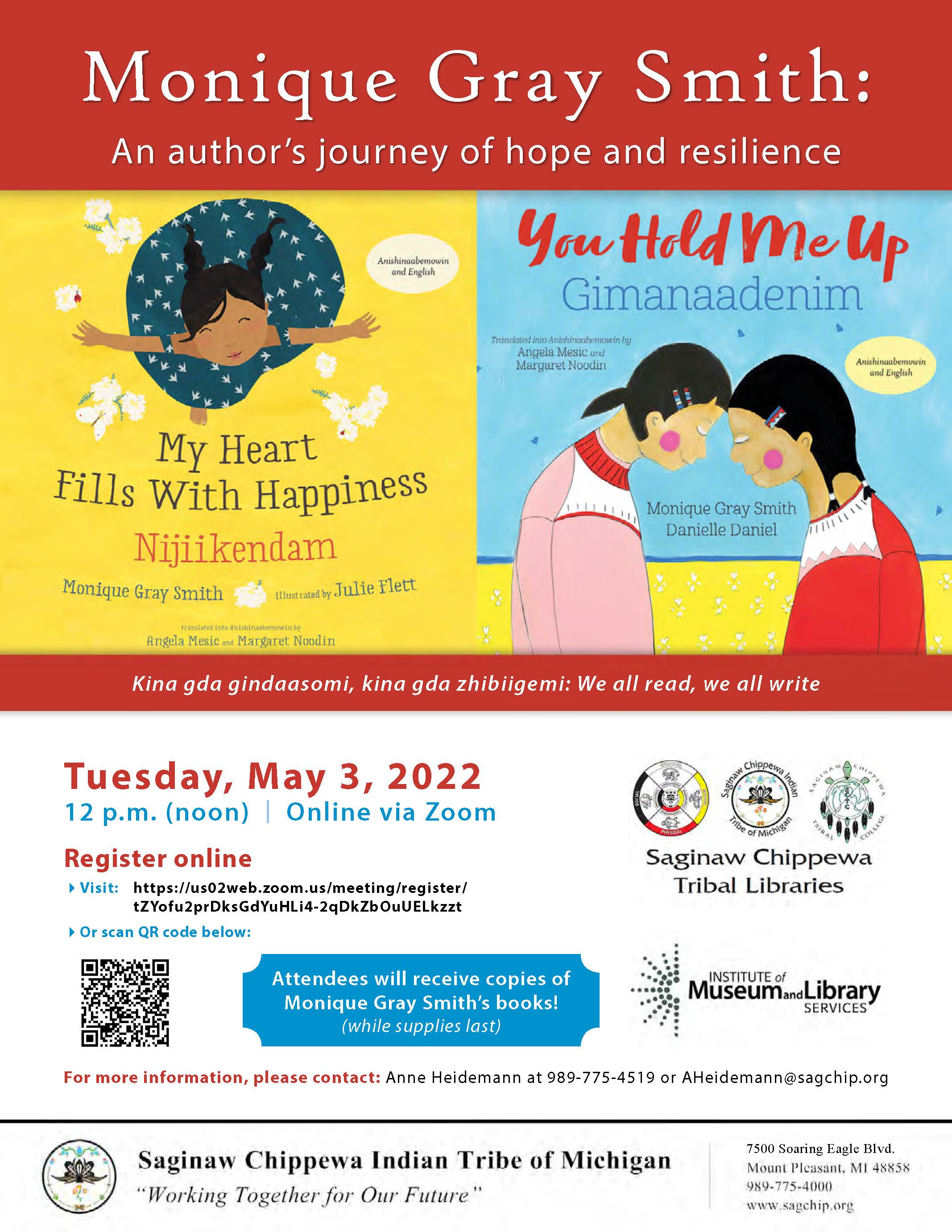 As part of the Kina gda gindaasomi, kina gda zhibiigemi: We all read, we all write grant project, the Tribal Libraries will welcome author Monique Gray Smith!