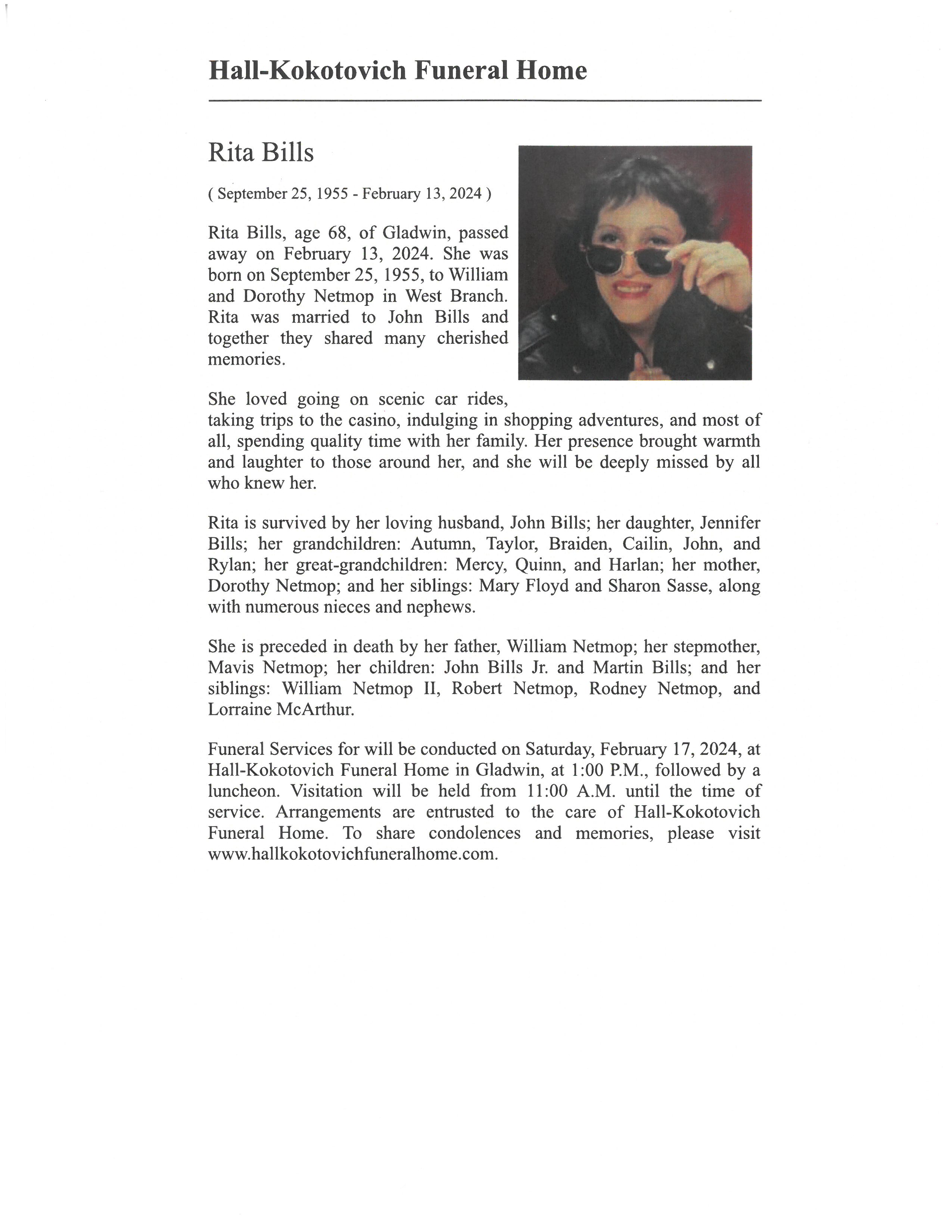 The family of Rita Viola Bills has notified the Tribal Clerk’s Office of her passing on February 13, 2024. Funeral arrangements are currently pending at this time. Rita was not a Veteran.