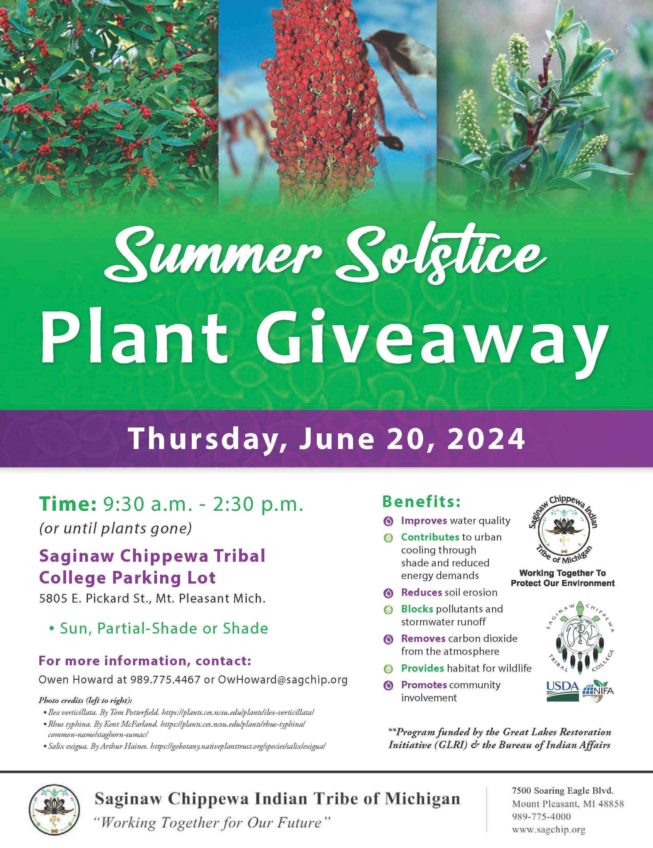 The Planning Department and the Environmental Team are hosting a free plant giveaway on Thursday, June 20 starting at 9:30am at the Saginaw Chippewa Tribal College’s Parking Lot (5805 E. Pickard St.). The event will last until 2:30pm or until trees are gone.