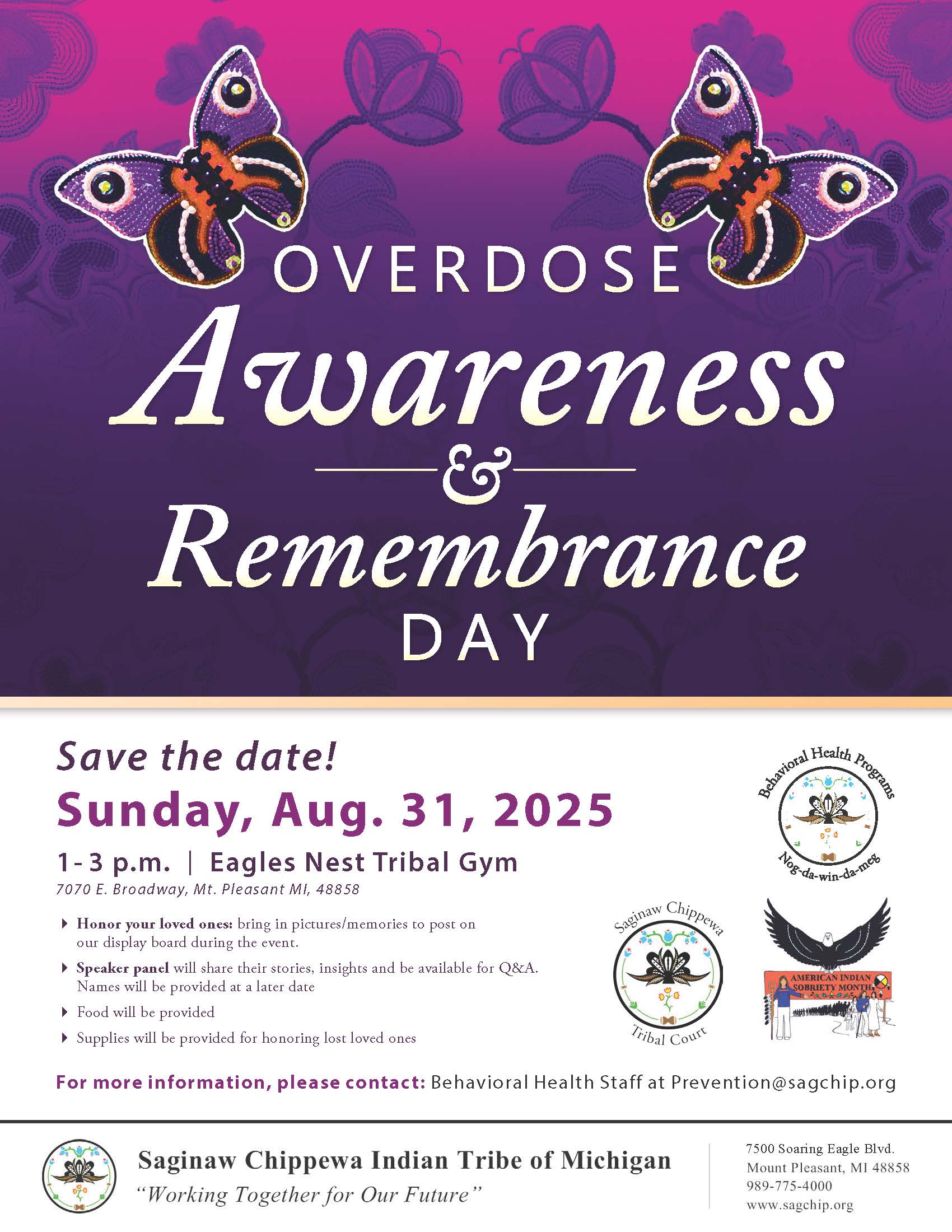 Please join Behavioral Health Prevention for Overdose Awareness & Remembrance Day on Aug 31st 2025 from 1-3pm at the Eagles Nest 7070 East Broadway. A lunch (Jersey Mikes) will be provided as we honor and remember those loved ones lost to addiction. This will be a time to give each other love, hugs, and support. There will be a panel of community speakers sharing their stories and offering encouragement to those still struggling and Q &A at the end of presentation. Tribal court has graciously offered to present their posters that is displayed at the Opioid Summit each year.