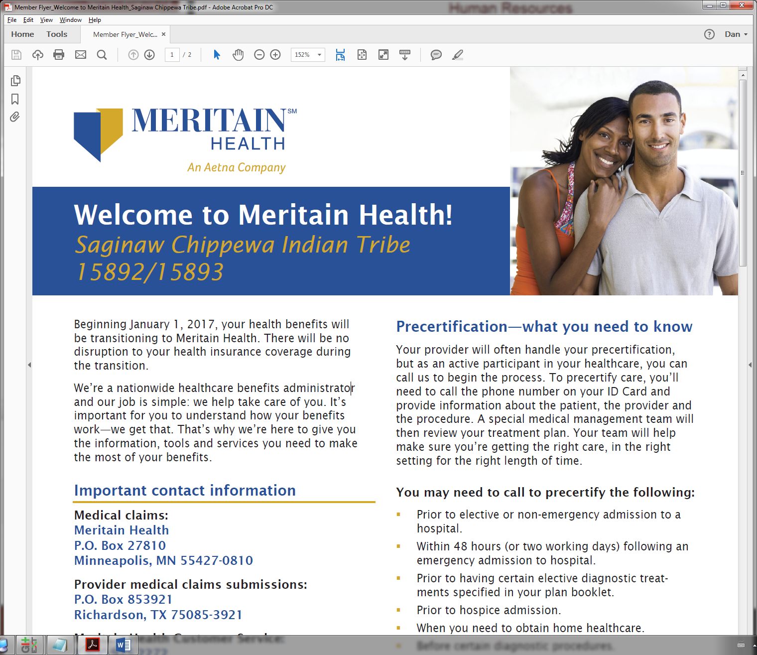 Beginning January 1, 2017, your health benefits will be transitioning to Meritain Health. There will be no disruption to your health insurance overage during the transition.