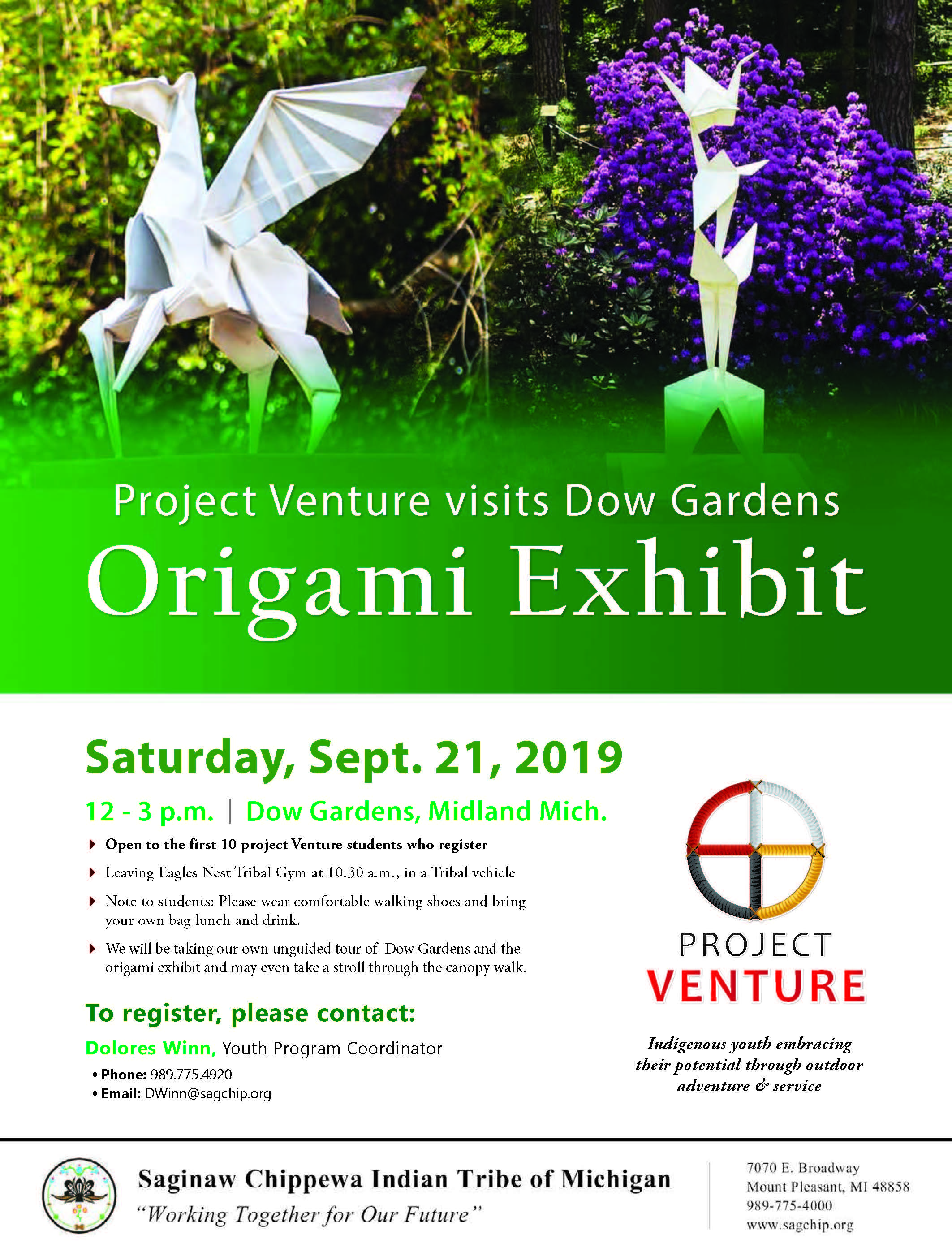 Project Venture outing to Dow Gardens Origami Exhibit next Saturday September 21st.