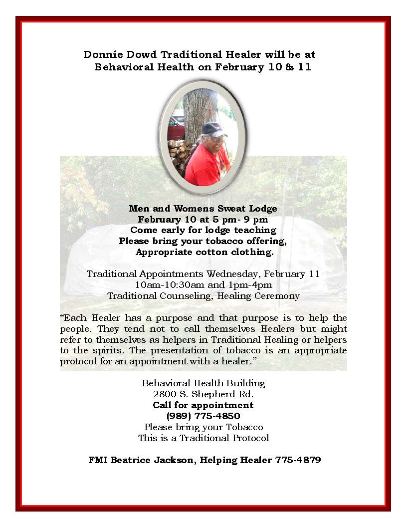 Donnie Dowd Traditional Healer will be at Behavioral Health on February 10 & 11