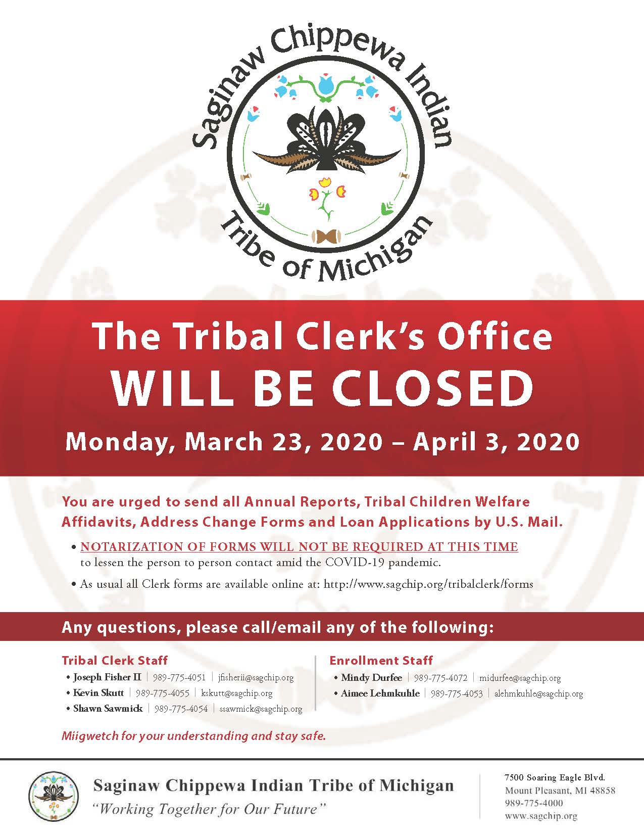 The Tribal Clerk’s Office WILL BE CLOSED Monday, March 23, 2020 – April 3, 2020