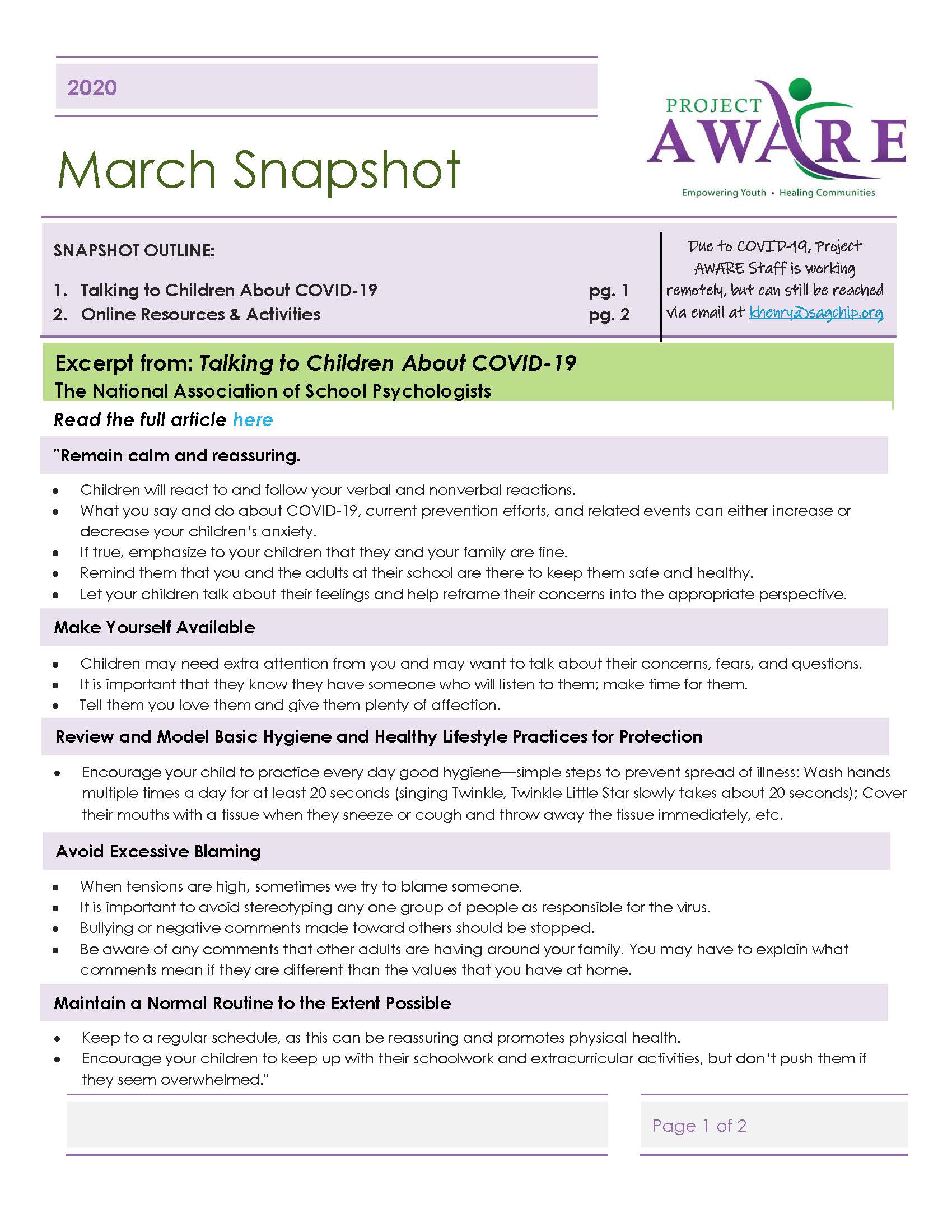 Please see the March Project AWARE Snapshot attached and below for information on Talking to Children about Coronavirus, and links to other information, resources and activities!