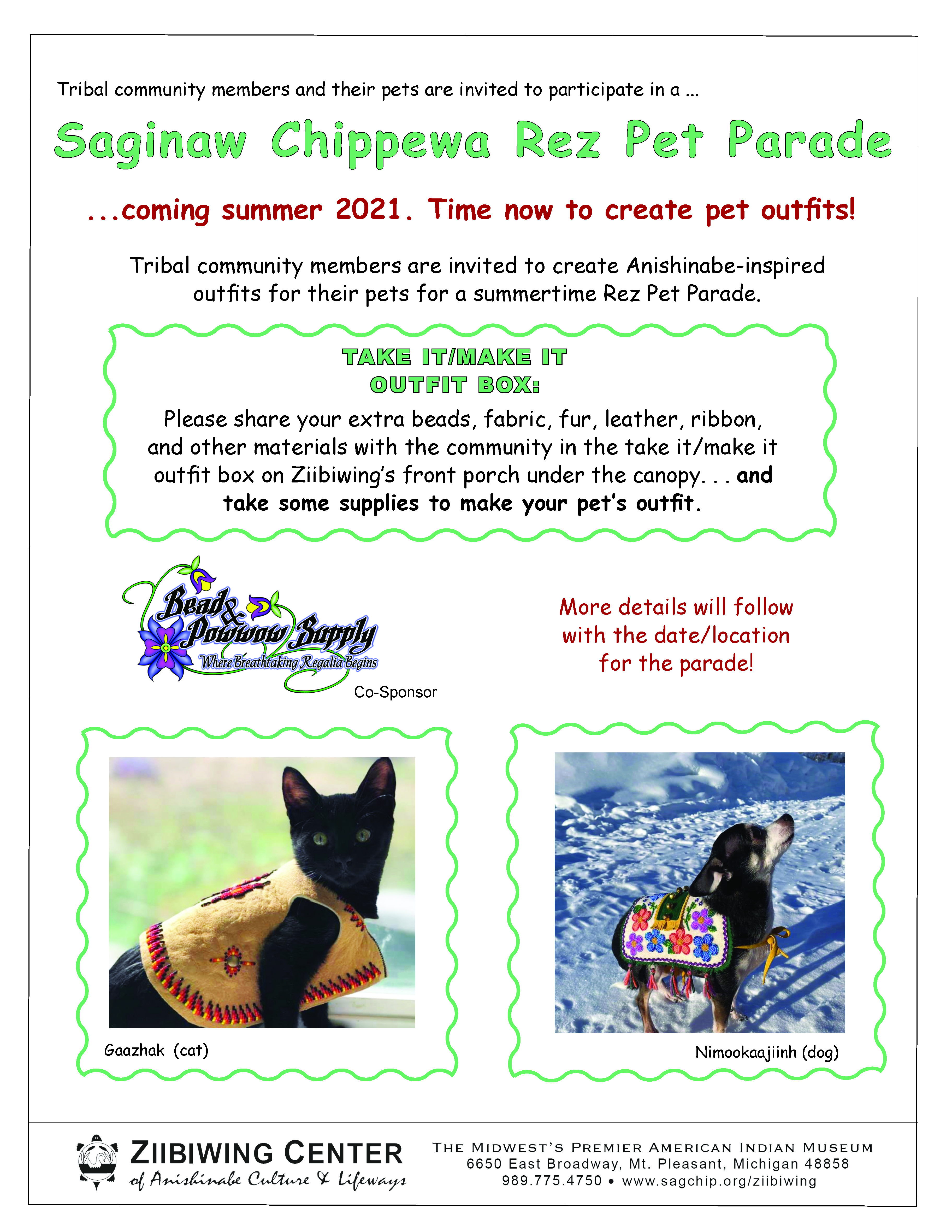 Please share your extra beads, fabric, fur, leather, ribbon, and other materials with the community in the take it/make it outfit box on Ziibiwing’s front porch under the canopy. . . and take some supplies to make your pet’s outfit.
