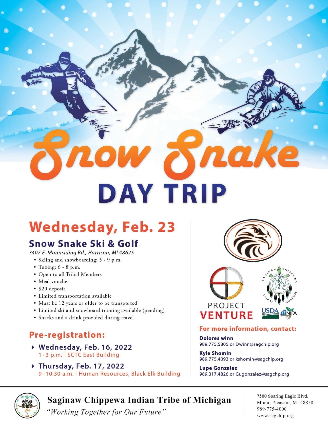 Due to inclement weather the Snow Snake Day trip is cancelled. We will provide more information as it becomes available as we look to reschedule. If you have any questions please contact Recreation at (989)775-4093.