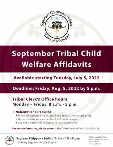 September Tribal Child Welfare Affidavits are due this Friday, August 5th by 5 pm. For questions please contact the Tribal Clerk’s office at (989) 775-4051.