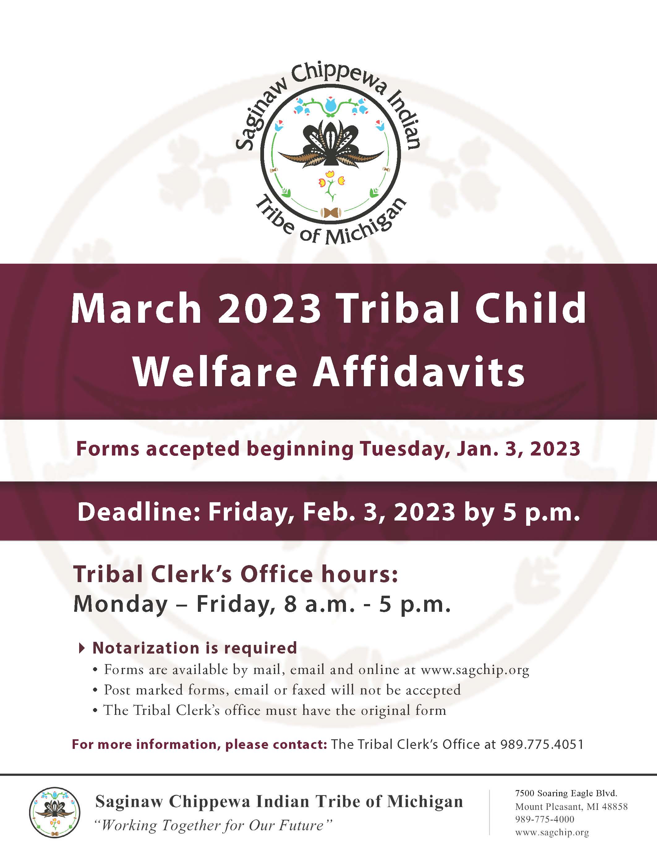 For more information, please contact: The Tribal Clerk’s Office at 989.775.4051