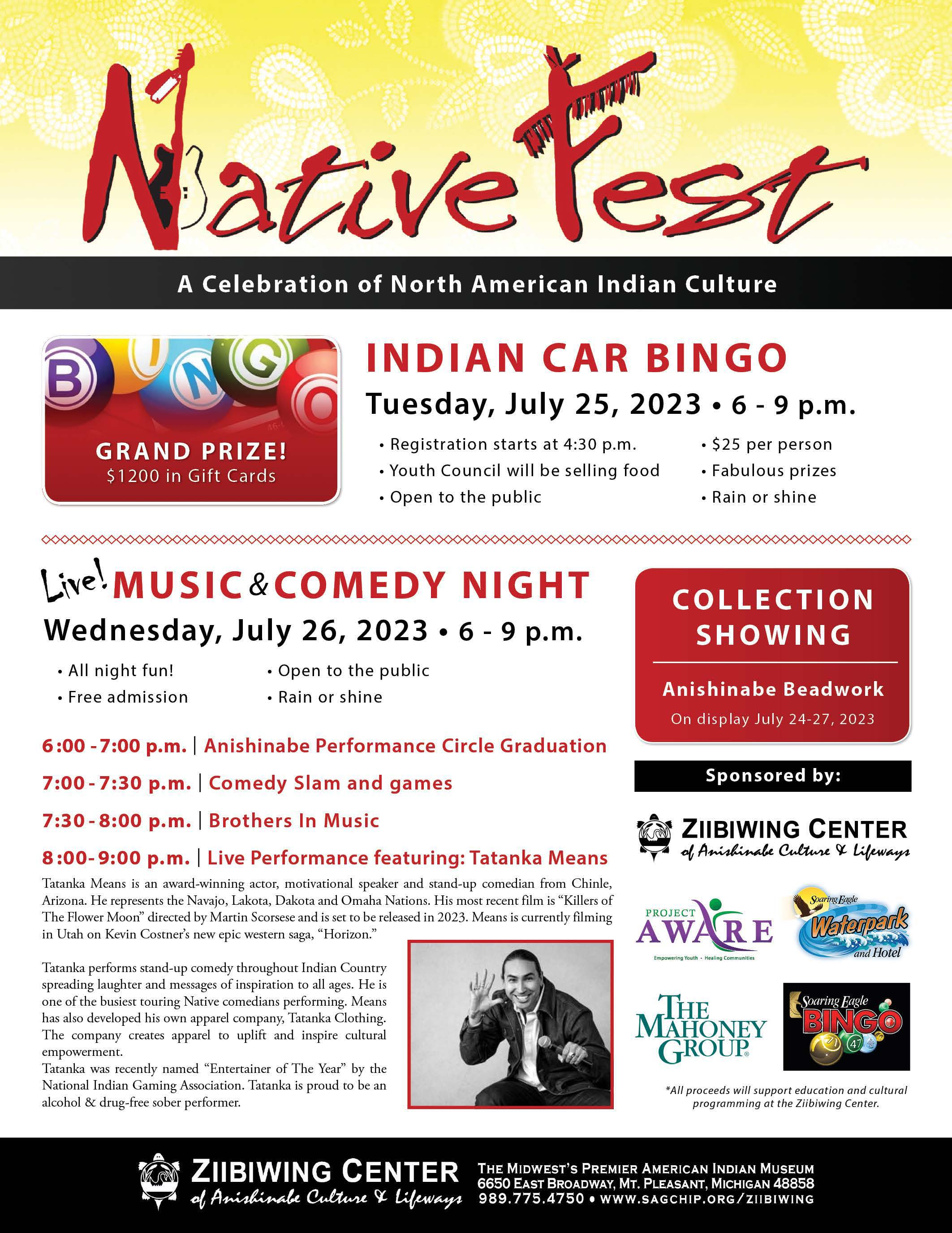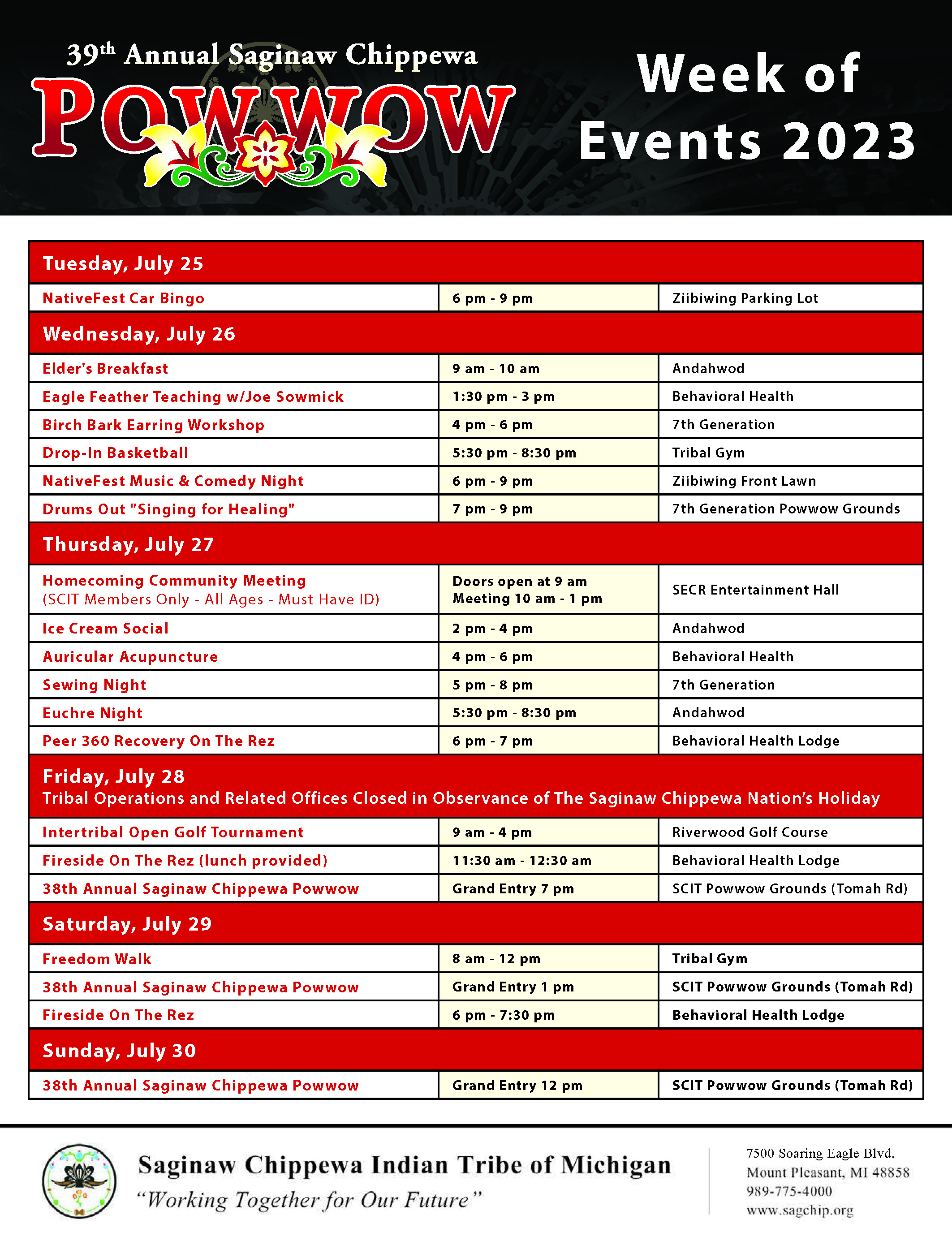 Please see the list of events taking place this week as we kick off our 39th Annual Saginaw Chippewa Powwow with NativeFest Indian Car Bingo!
