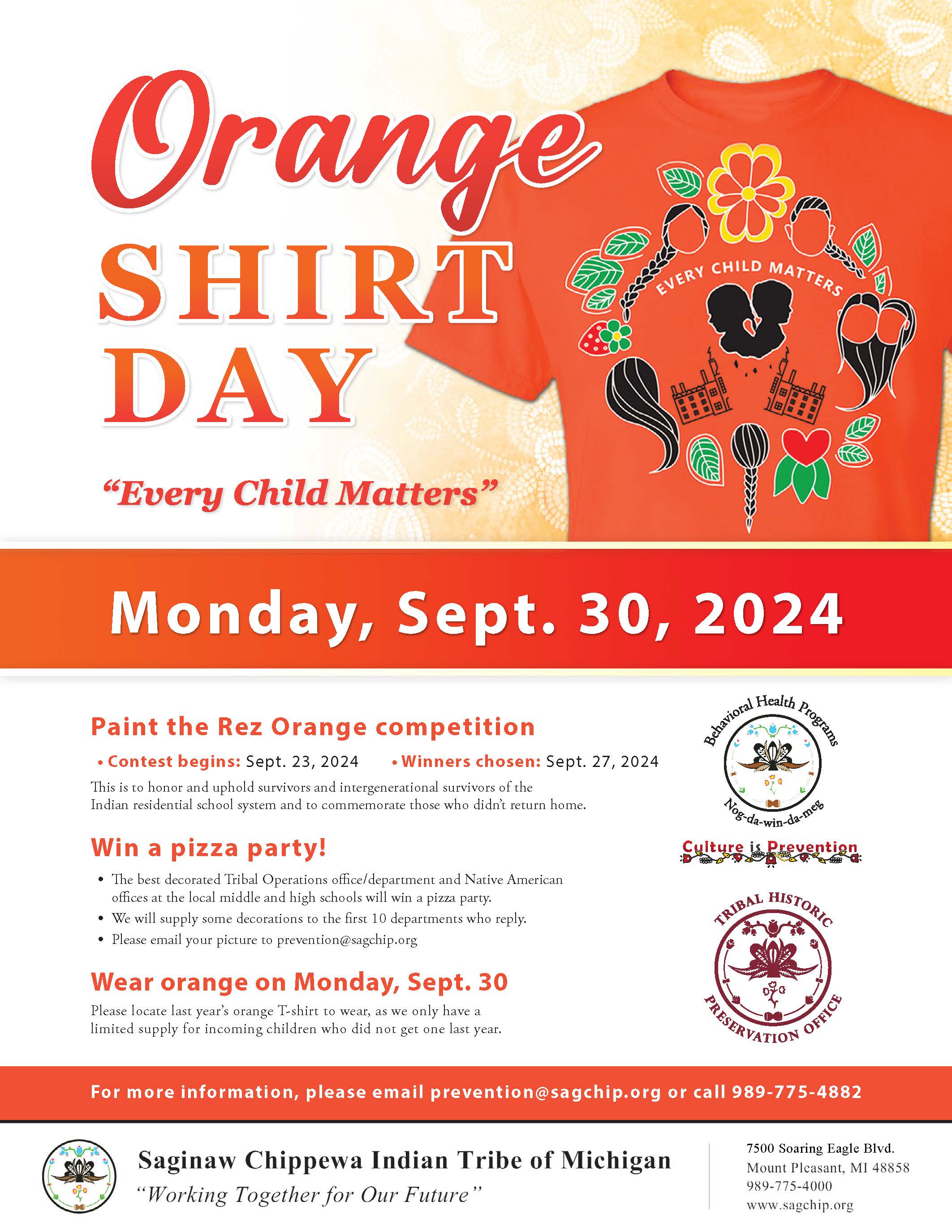 Please locate last year’s orange t-shirt to wear on Sept 30th as we only have a limited supply for incoming children who did not get one last year.