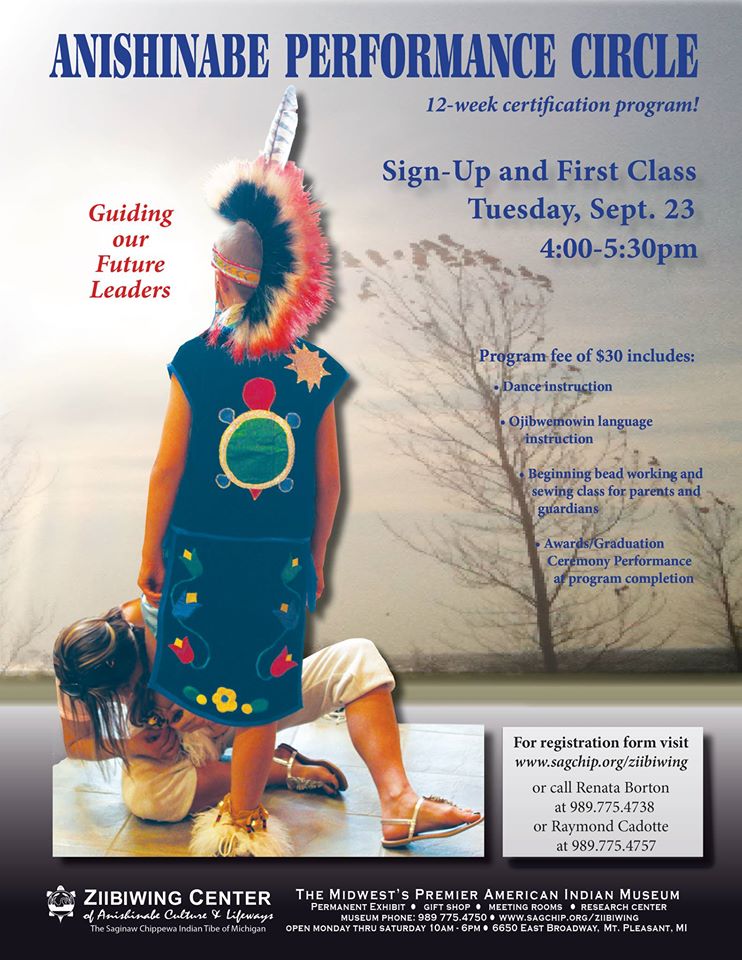 Welcome to the Anishinabe Performance Circle hosted by the staff and volunteers from the Ziibiwing Center. You must have the registration packet filled out completely and the registration fee paid to hold a spot for your child in the Anishinabe Performance Circle. The registration form will enable us to better meet the needs of your child. The $30.00 registration fee will help cover the cost of speakers and other expenses.