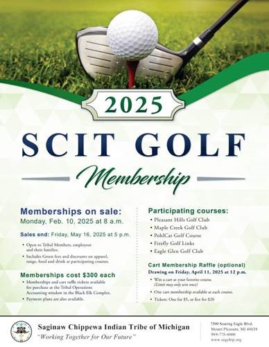 SCIT Golf Memberships are still available at $300 each until Friday, May 16, 2025 at 5 pm. Memberships are available for purchase for all Employees, SCIT Members and their families. The courses included this year are: Eagle Glen Golf Club, Firefly Golf Links, Maple Creek Golf Club, Pleasant Hills Golf Club and PohlCat Golf Course. Please visit the accounting window in the Black Elk Building to purchase yours.