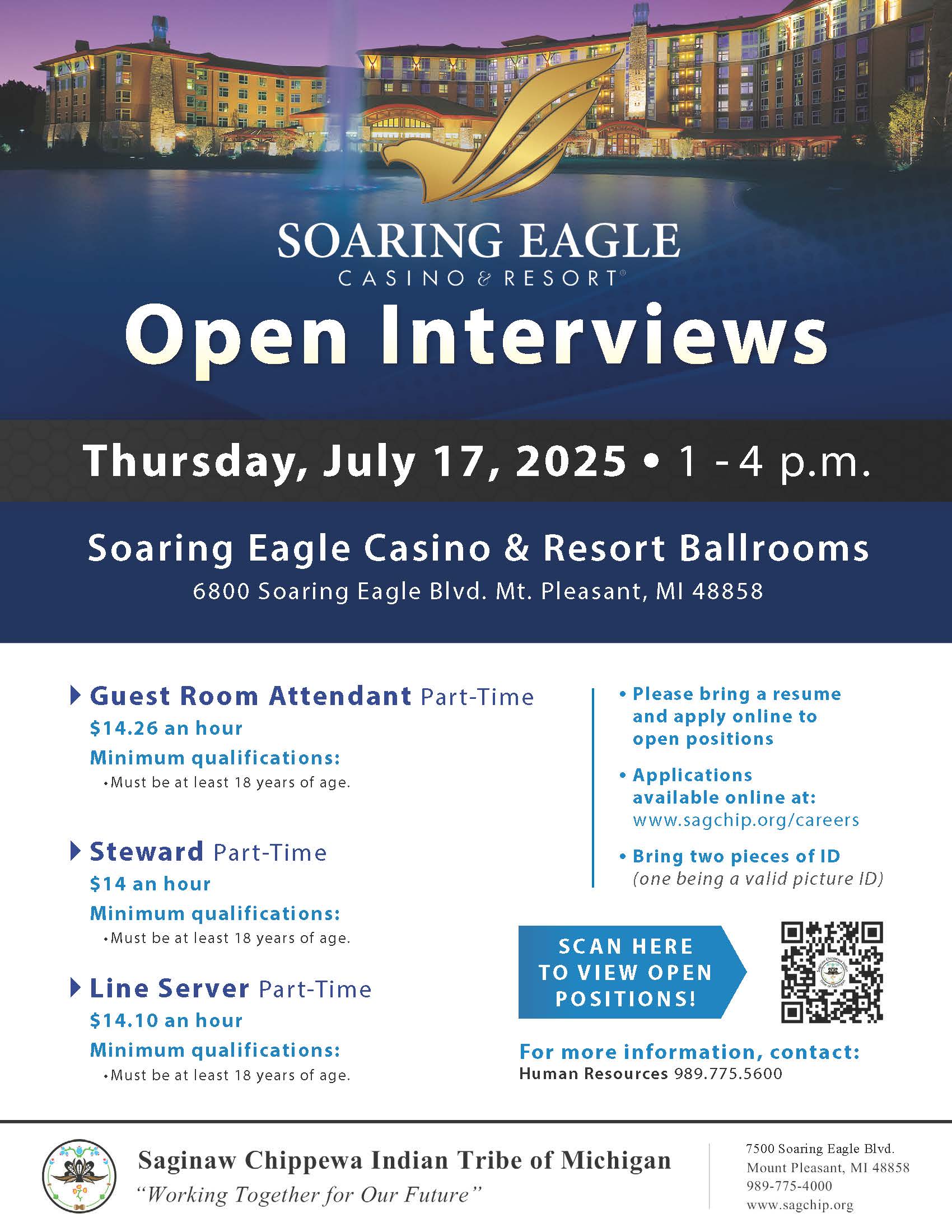SECR Hotel BallroomsThursday, July 17, 20251 pm – 4 pm • Guest Room Attendant• Steward• Line ServerSee posting for further details or contact Human Resources directly at 989-775-5600.