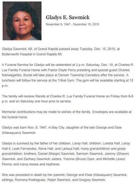 A Funeral Service for Gladys will be celebrated at 2 p.m. Saturday, Dec. 19, at Charles Lux Family Funeral Home with Pastor Doyle Perry presiding and special guest Chaarles Nahwegahbo. Burial will take place at Denver Township Cemetary after the service. A luncheon will follow the service at the Tribal Gym. The gym will be available at 12 p.m.