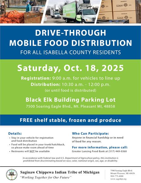 The semi-truck from the Greater Lansing Food Bank will be rolling into the Saginaw Chippewa Indian Tribe around 8:30am and we are requesting your help to get the word out for volunteers and letting families know the date on social media. Cars will start to line up after 9am and distribution is scheduled from 10:00am -12:00pm. The event will take place at the Black Elk Government Complex parking lot and will continue until all food is distributed.