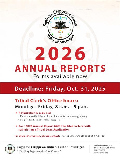 2026 Annual Report Deadline Tomorrow: Friday, October 31, 2025 by 5 pm. There are currently 82 annual reports still out. For all questions, please contact the Tribal Clerk’s office directly at 989-775-4051.