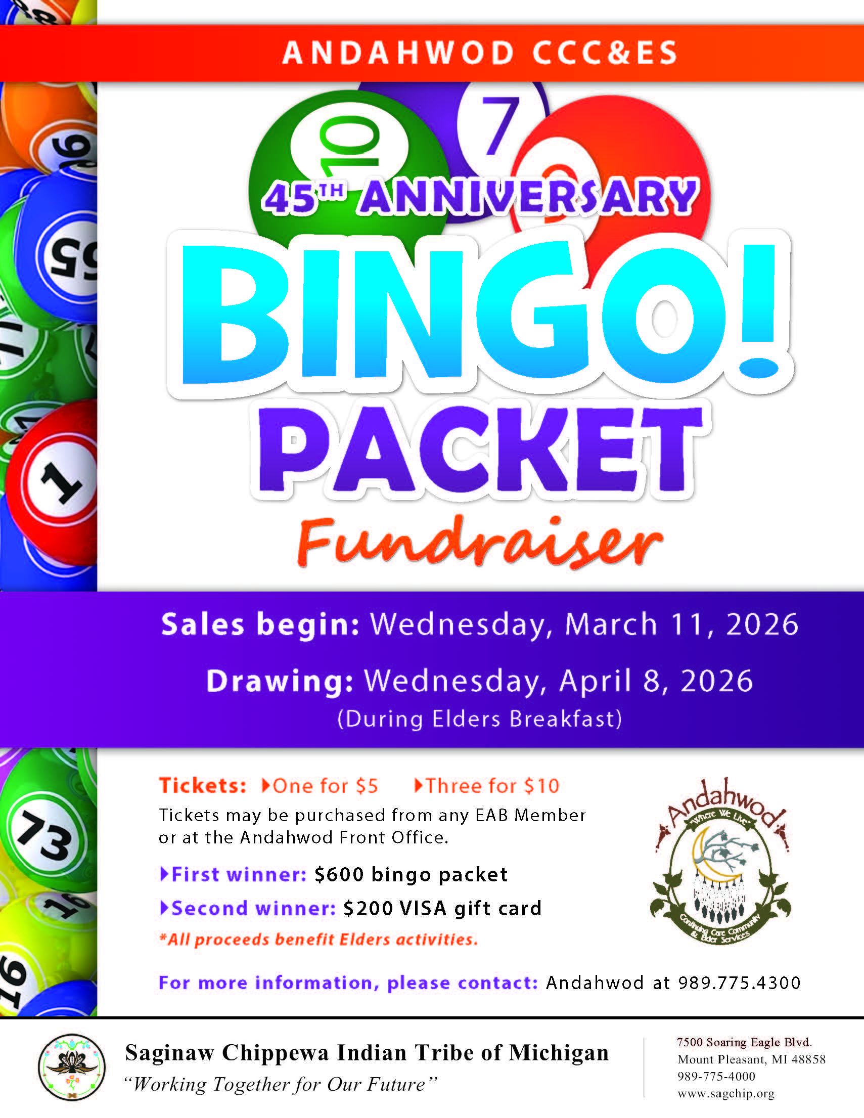 For more information, please contact: Andahwod at 989.775.4300