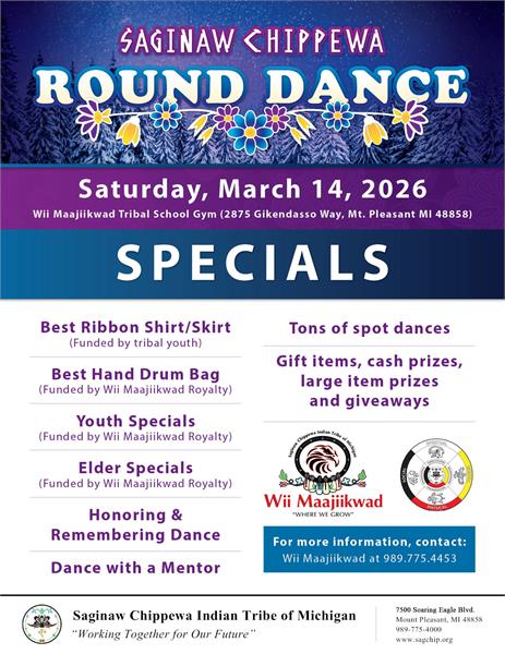 Please join us for the Saginaw Chippewa Round Dance tomorrow, Saturday, March 14th at the Wii Maajiikwad Tribal School Gym with doors opening at 5:30 pm!
