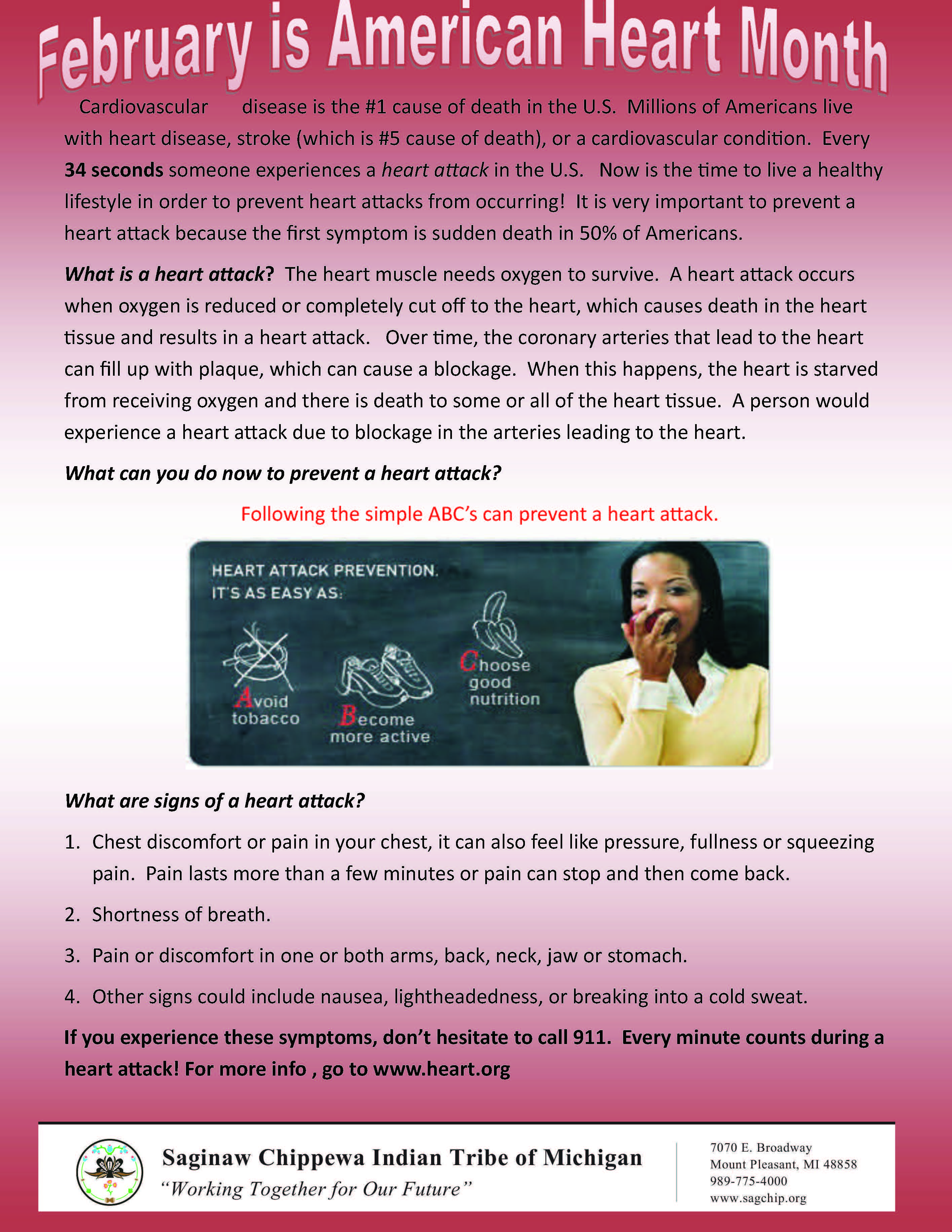 If you experience these symptoms, don’t hesitate to call 911. Every minute counts during a heart attack! For more info , go to www.heart.org