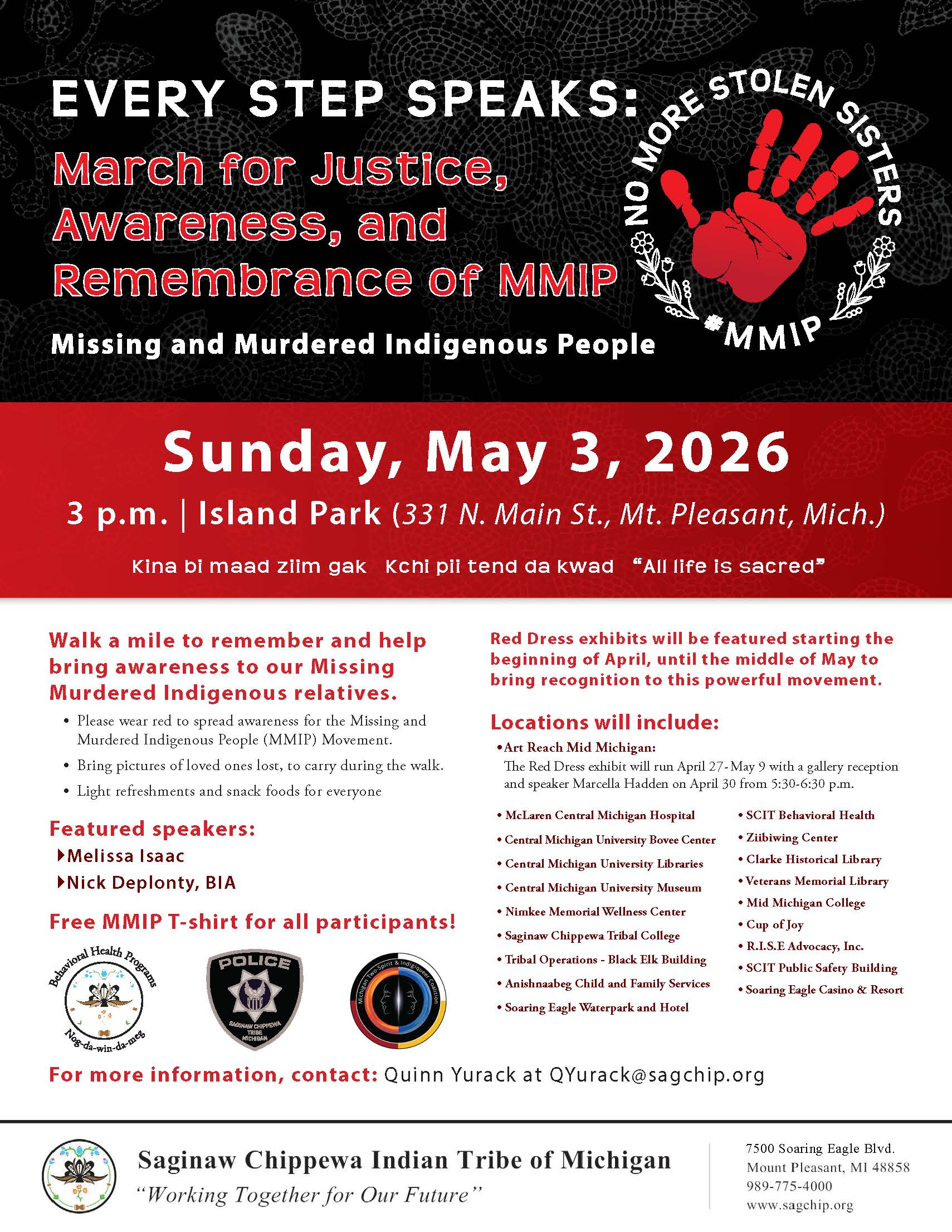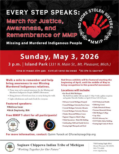 The event will include a one-mile walk to honor Missing and Murdered Indigenous People, featured speakers, and opportunities to reflect and show support for this important movement. Participants are encouraged to wear red to help raise awareness.