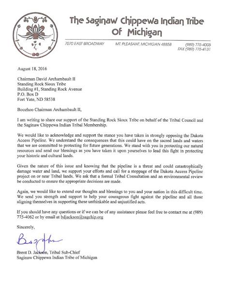 The Saginaw Chippewa Indian Tribe expresses support to the Standing Rock Sioux Nation as they stand in opposition to the Dakota Access Pipeline. Attached is a letter sent to Standing Rock Sioux Tribal Chairman, David Archambault II.